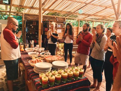Our nutritious vegetarian meals are served buffet-style three times daily (if there are less than 5 guests we do plate the meals instead of buffet). Guests visiting for one of our scheduled retreats will already have all three meals included. Those joining us for a personal retreat have already paid for breakfast and dinner as part of their package, and can choose to join us for lunch for an added price of 80Q.